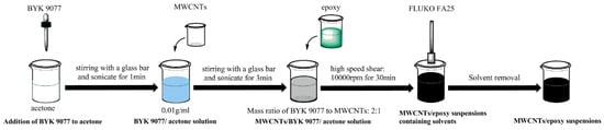 Secondly, the dispersion is always an urgent problem in the application of carbon nanotubes. A variety of dispersion methods, such as ultrasonic, ball milling, and mechanical agitation were previously applied. The solution processing of composites which mixed the polymer and nanotube in a suitable solvent and cooperated with the above dispersion methods was developed to improve dispersion [17,18,19]. Arun et al. [20] reported an approach by simultaneously applying ultrasonic waves and shear force generated by an axial flow impeller to obtain a superior level of dispersion of multi-walled carbon nanotubes in epoxy. Then, more approaches were developed to improve the dispersion of carbon nanotubes, among which the functionalization of carbon nanotubes was the most effective. Strong acids and other oxidizing agents were used to generate various functional groups such as carboxyl, ketone, etc., and amination, fluorination, etc. were introduced via further reactions. In addition, non-covalent functionalization approaches, such as special polymers [21] and sodium dodecyl sulfate (SDS) [22], were also used to improve the dispersion of MWCNTs. Studies focusing on the dispersion of CNTs using functionalization were frequently reported in recent publications. Gröschel et al. [23] reported that the selective adsorption of Janus micelles (JMs) on MWCNTs changed the compatibility between CNTs and the matrix, which facilitated the dispersion of MWCNTs. Parveen et al. [24] utilized Pluronic F-127 as a novel dispersing agent to achieve a short dispersion route in cementitious composites. In our experiment, a solution-based high-speed shear dispersion method was developed, and functionalized MWCNTs and a surfactant (BYK 9077) were also applied in the dispersion process.