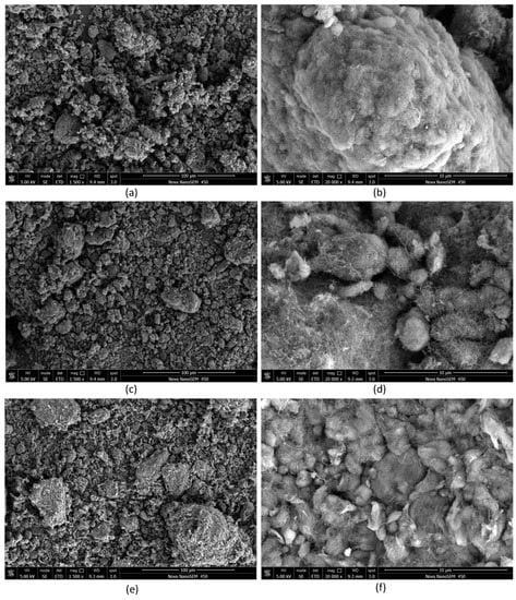 The microscopic morphologies of carbon nanotubes with three different lengths (50, 10–30, and 0.5–2 μm) are shown in Figure 2. At low magnification, MWCNTs prepared using CVD were all in an agglomerated state, but the morphologies of agglomerates with different lengths were different. Granular agglomerates were predominant in MWCNTs with a length of 50 μm (Figure 2a), but some bundles of agglomerates were also presented and there was obvious adhesion between the agglomerates. MWCNTs with a length of 10–30 μm (Figure 2c) were in the form of granules without bundle agglomerates, and the surface of the particles was relatively smooth. There were larger agglomerates 100 μm in size in MWCNTs with a length of 0.5–2 μm (Figure 2e). Granular agglomerates also accounted for the majority, but some of the particles were slender. At high magnification, it was found that the larger agglomerates in the three kinds of MWCNTs were composed of smaller agglomerates. As shown in Figure 2b,d, the surface of small agglomerates in MWCNTs with a length of 50 μm was rough, and the adhesion between small aggregates was tight. On the other hand, the surface of MWCNTs with a length of 10–30 μm was smoother, and the bonding between them was relatively loose. In Figure 2f, some of the small agglomerates of MWCNTs with a length of 0.5–2 μm were spindle-shaped, which was different from the shape of agglomerates in the first two kinds of MWCNTs.