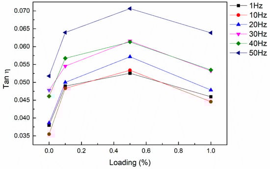 The loss factor of nanocomposites with different loading amounts is shown in Figure 6. With the increase in loading amount, the loss factor increased firstly and then decreased, which was also related to the dispersion of carbon nanotubes in the matrix. At lower filler percentages, there was a better distribution of MWCNTs within the matrix. With an increase in filler percentage, the MWCNTs dispersed more randomly in the resin and, therefore, the formation of local MWCNT clusters increased. The adhesion characteristics of MWCNTs and the epoxy matrix started deteriorating, resulting in interfacial slippage occurring under such circumstances. Alva et al. [43] reported that CNT agglomerations likely contribute to damping due to mutual slippage between the CNTs. However, this effect of agglomerates on damping was not consistent with the experimental results in this paper. The method of dispersion reported in the previous work [43] involved manual stirring for 15 min. This method can hardly open the agglomerates, even with the lowest addition amount, and it is also difficult to control the consistency of dispersion. It is reasonable to believe that the increase in loss factor with 0.75 wt. % loading in their experiment was probably due to the macroscopic defects caused by the excess agglomerates. The agglomerates in the poorly dispersed MWCNT nanocomposites can act as large spherical particles if higher filler loading amounts are present. Compared with uniformly dispersed carbon nanotubes, the interface between MWCNTs and the matrix is directly reduced. Moreover, the specific surface area of the spherical particles is relatively small, which further reduces the interface contact. Additionally, the spherical particles or near-spherical particles are less flexible compared to the well-dispersed carbon nanotubes, and still have a higher modulus than the surrounding matrix. Thus, the particles do not easily deform during vibrations, which leads to reduced deformation within the particles. This further reduces the internal interface slip of the particles, and ultimately causes a decrease in the loss factor. Therefore, agglomerates play a negative role in damping.