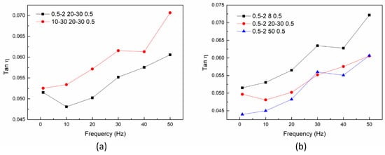 The relationship between the length of carbon nanotubes and the loss factor is shown in Figure 7a. The specific surface area, loading, and carboxyl functional group content of these two carbon nanotubes were identical. The longer carbon nanotubes showed higher loss factors. The results of Section 3.2 and Section 3.3 showed that the dispersion uniformity of these two carbon nanotubes was basically the same. Hence, nanocomposites with higher aspect ratios of C-MWCNTs were highly effective in enhancing the damping of the epoxy matrix. This is likely due to a similar reason as for the reduction of Tg. The longer carbon nanotubes had stronger resistance for the cross-linking of epoxy resins and prevented entanglement between the molecular chain segments of the matrix, which provided a larger free volume for the movement of the molecular chains of the matrix and facilitated the movement of molecular chain segments of the matrix with vibration. The relationship between the diameter of carbon nanotubes and the loss factor is shown in Figure 7b. The smallest-diameter CNT-reinforced nanocomposite (0.5–2, 8, 0.5) exhibited the largest loss factor, and this result corresponds well with the mechanism of damping enhancement of CNT-reinforced nanocomposites. In addition to the larger aspect ratio, the smallest-diameter carbon nanotubes had the largest specific surface area and content of carboxyl groups. In Section 3.4, both samples No. 3 (10–30, 20–30, 0.5) and No. 5 (0.5–2, 8, 0.5) with the greatest decrease in Tg displayed the largest loss factor, which is in good agreement with the above analysis.