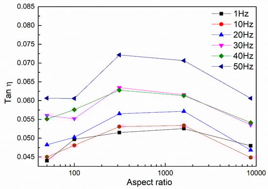 Taking the loss factor of different samples as the vertical coordinate and the logarithm of aspect ratio as the horizontal coordinate, the relationship between the aspect ratio of C-MWCNTs and loss factor is shown in Figure 8. With the increase in aspect ratio, the loss factor of C-MWCNT-reinforced nanocomposites firstly increased and then decreased. The MWCNTs of sample No.8 (50, 8–15, 0.5) had the largest aspect ratio, but the loss factor was equal to that of No. 7 (0.5–2, >50, 0.5) which confirmed the negative effect of carbon nanotube agglomerates on loss factors. Compared with the loss factors of samples No. 3 (0.5–2, 8, 0.5) and No. 5 (10–30, 20–30, 0.5), the loss factor of No. 5 was slightly higher than that of No. 3 at low frequency. However, with the increase in frequency, the loss factor of sample No. 3 exceeded that of No. 5, which was probably due to its higher specific surface area. As the frequency increased, more interface slippages were activated, thus increasing the loss factor.