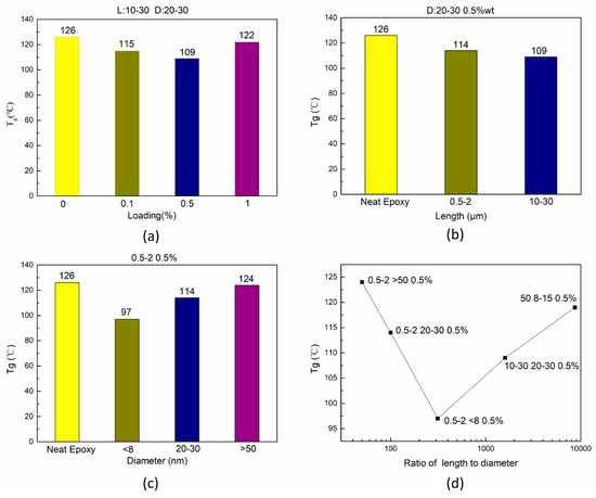 Th relationship between Tg and loading (a); length of MWCNTs (b); and diameter of MWCNTs (c); the ratio of length to diameter (d).