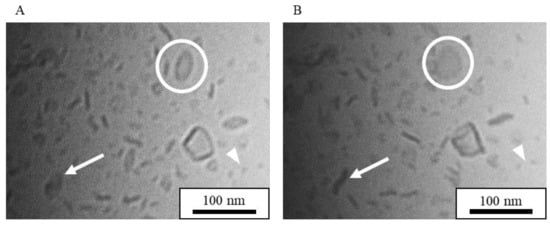 Cryo-TEM provided images of the suspensions directly without negative staining or drying, and the sample stage could be tilted for imaging at various angles []. Figure 1 shows cryo-TEM images of NI-LNs prepared with HSPC/DPPG (5/1) before and after tilting the sample stage by 20 degrees. The shape of most particles changed after the tilting. For example, the rod-like particle before tilting (circled in Figure 1A) became circular (Figure 1B); whereas, the opposite occurred for the particles indicated by arrows. These changes indicated flat particles, as previously reported []. There were also small micelles about 10 nm in diameter, as indicated by arrowheads. Thus, flat particles and micelles coexisted in standard NI-LN suspensions.