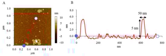 Atomic force microscopy (AFM) imaging of standard NI-LNs. (A) AFM image and (B) cross-sectional profile.