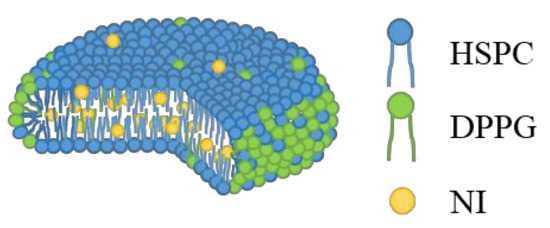 In bicelles, long-chain lipids (C16–20) generally form the planar area, and short-chain lipids (C6–8) form the edge area [,]. Diheptanoylphosphatidylcholine (DHPC, C6) is usually used as short-chain lipids forming the edge area, but there are some examples except for short-chain lipids; e.g., dimyristoylphosphoethanolamine (C14) introduced by lanthanide to the head group [], n-dodecylphosphocholine (C12) that had one alkyl chain [], and ceramide (C16) bound to polyethylene glycol (PEG)-5000 []. As the feature of these materials, they had large head areas. It was reported that hydrophilic surfaces with high curvature can be formed by anionic lipids because the head volume is expanded by strong electrostatic repulsion in low ionic strength media []. In the present study, the bicelles formed here used phospholipids with similar alkyl chain lengths: HSPC (C12–20) and DPPG (C16). However, anionic DPPG might have a large head area, because there were micelles when only DPPG was contained in the formulation in cryo-TEM images and PG with a negatively charged head group could be self-assembled at high curvatures. Therefore, we speculated that DPPG was localized in the edge area, and HSPC was in the flat area to form bicelles (Figure 3).