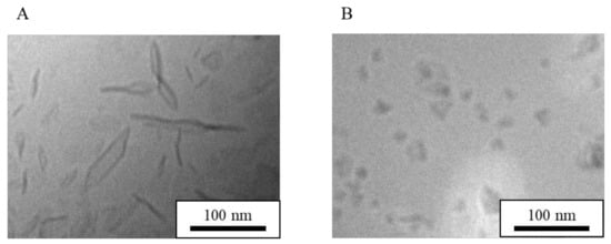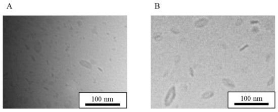 Cryo-TEM images in Figure 8 show NI-LNs prepared under different high-pressure homogenization conditions. For a 100-MPa/100 pass under reduced pressure, there were bicelles and micelles similar to standard NI-LNs, but some particles remained large because of the weaker applied shearing force (Figure 8A, Table 9). There were variations that suggested Ostwald ripening. In this case, the stability was inferior to that of NI-LNs prepared under standard conditions. Low NI concentration (Table 10) resulted from the particles having a large size, which were removed by the 200-nm filter membrane. For a 175 MPa/150 pass under increased the pass number, the size became smaller than that of NI-LNs prepared under standard conditions (175 MPa/100 pass). It was possible to observe bicelles that had different widths (Figure 8B). When the pass number increased, the particles had smaller absolute value of zeta potentials and low NI concentration (Table 10). This might be due to the adhesion of the sample (especially DPPG) to the flow path of Microfluidizer®. Therefore, the standard condition was the most efficient method. These results suggested that the high-pressure homogenization conditions did not affect the structure, but did affect the size and entrapped drug concentration of the lipid nanoparticles.