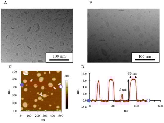 AFM provides three-dimensional images. Figure 2A shows AFM images of standard NI-LNs, and Figure 2B exhibits the cross-sectional profile taken along the red line in Figure 2A, where the blue point corresponds to zero in the profile. The NI-LNs were five-nm high and about 50 nm in diameter (Figure 2B), which was consistent with the cryo-TEM images. The thickness of a lipid bilayer is four to six nm [,]; thus, the NI-LNs were a single lipid bilayer. Spherical vesicles such as liposomes sometimes strongly adsorbed onto the substrate, resulting in heights over 10 nm that indicated double lipid bilayers []. The phospholipids used here were saturated and relatively rigid, and would be difficult to deform during adsorption. Therefore, the images suggested that the standard NI-LNs seem to be disk-like bicelles (Figure 3).