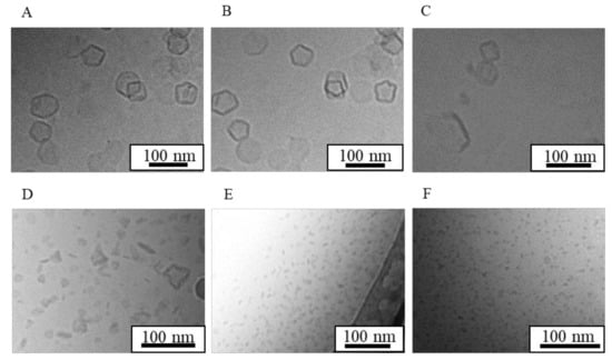 NI-LNs were prepared with HSPC/DPPG ratios of (5/0), (5/0.5), (5/1), and (0/5), and LNs (no drug loading) was with HSPC/DPPG (5/0), (5/1), and (0/5). Figure 6 shows cryo-TEM images, and Table 5 lists the physicochemical properties of each lipid nanoparticle. The shapes of NI-LNs prepared with HSPC/DPPG (5/0) did not change markedly when the sample stage was rotated by 20 degrees (Figure 6A,B). Thus, the particles were not flat, and could have been polygonal liposomes []. Additionally, a week after preparation, slight aggregation occurred because there was little electrostatic repulsion for lack of DPPG. The DLS mean particle size was about 350 nm two weeks after preparation (data not shown), which was more than three times that just after preparation. The NI concentration was low (2.9 µg/mL) (Table 6), because NI might exist in only the lipid bilayer area of liposomes. Furthermore, as for HSPC/DPPG (5/0), the appearance of LNs suspensions just after 100-pass high-pressure homogenization was still cloudy, indicating that it was difficult to make a particle made from only HSPC smaller, so big particles were trapped by a 200-nm filter membrane. In fact, lipid concentration pass through filter membrane was low (data not shown). So, NI concentration would be low. There was no difference in structure for the no-drug LNs prepared with HSPC/DPPG (5/0) (Figure 6C), relative to that for the NI-LNs. They could not be prepared reproducibly, which indicated large S.D. values of their mean particle size, and their zeta potentials were almost neutral because of lacking DPPG (Table 6). NI-LNs prepared with (5/0.5) (Figure 6D) exhibited morphologies that were between liposomes (5/0) and bicelles (5/1) that corresponded to the DPPG ratio, and the ratio of bicelle/micelle/liposome was about 7/2/1 (Table 5), suggesting that because the amount of DPPG was not enough to form bicelles, the liposomes derived from HSPC still existed. NI-LNs prepared with (0/5) (Figure 6E) were only micelles with a few nanometers in size; there were no bicelles or liposomes, indicating that there were no micelles in the lipid nanoparticle suspensions without DPPG. For HSPC/DPPG (0/5) (Figure 6F), there was no difference in the micellar structure between NI-LNs and LNs. Therefore, the encapsulated drugs did not affect the particle structures. Although big differences in the mean particle size of HSPC/DPPG (0/5) between Table 5 and Table 6 were seen, large particles were not observed in cryo-TEM images, and the value in Table 5 might be more accurate, because DLS is commonly influenced by fewer large particles. Moreover, the highest NI concentration (98.0 µg/mL) (Table 6) was reduced almost by half three weeks after preparation (data not shown), and crystalline NI was observed, suggesting an instability of micelles. Therefore, standard NI-LNs had high NI concentrations and good stability. These results suggested that the lipid composition ratio dramatically affected the structure, the physicochemical properties, and the stability of lipid nanoparticles.