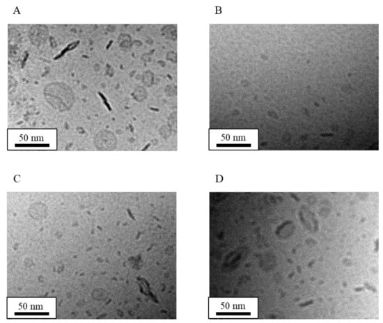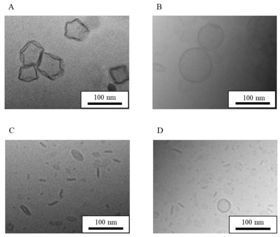 Cryo-TEM images in Figure 9 revealed NI-LNs prepared from HSPC/DPPG/Chol (5/0/0) and (5/1/0), as well as from HSPC/DPPG/Chol (5/0/2) and (5/1/2). For HSPC/DPPG/Chol (5/0/2), the surface asperities disappeared, and the particles became smooth (Figure 9B). Since there was no difference in the widths of identical particles before and after sample stage rotation, the structures were spherical. Thus, lipid nanoparticles prepared from HSPC/DPPG/Chol (5/0/0) were liposomes. NI-LNs prepared with HSPC/DPPG/Chol (5/1/2) were bicelles and micelles, similar to standard NI-LNs, but liposomes were also present (Figure 9D). It was reported that when the Chol content was 20 mol% or less in liposomes, there were two phases: a miscible phase composed of Chol and lipids, and a lipid phase composed only of lipids []. For a Chol concentration of more than 20 mol%, there were spherical liposomes formed by the miscible phase, and micelles and bicelles formed by the lipid phase.