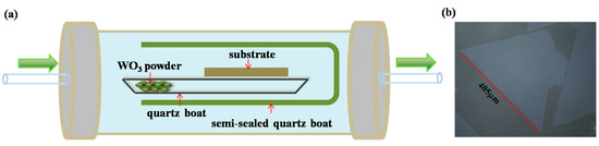 (a) Schematic diagram of CVD growth system; (b) optical image of WS2.