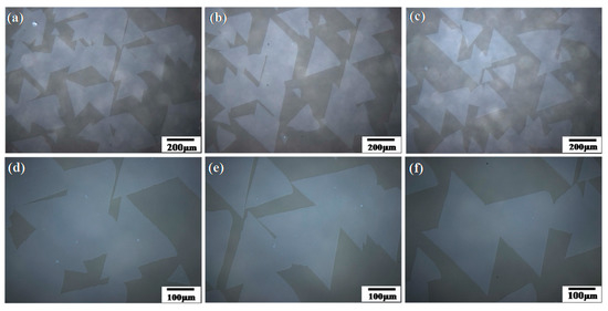 Optical images of the triangles at different locations with different magnifications: (a–c) are the images with a magnification of 10×; (d–f) are the images with a magnification of 20×.
