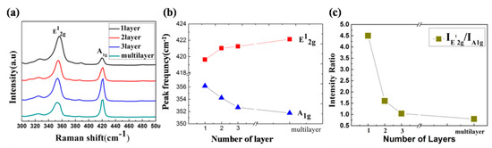(a) Raman spectra with different WS2 thicknesses; (b) frequency change of A1g and with different thicknesses; (c) ratio with different layers.
