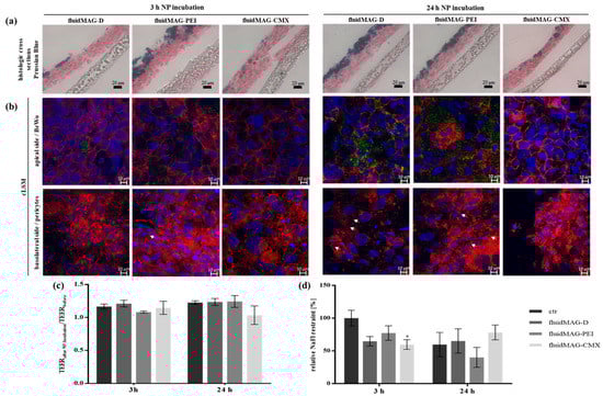 The behavior and interaction of the differently charged SPIONs (Table S1) in the co-culture BPB model were investigated microscopically for exposure times of 3 h and 24 h by means of histologic cross sections and laser scanning microscopy upon fluorescent staining (Figure 2a,b).