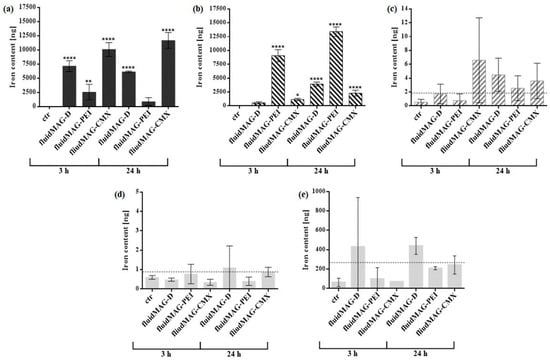 Data revealed that PEI-coated particles show the strongest interaction capacity with the BeWo cells, indicated by detected SPION amounts as high as 13.4 ± 0.9 µg after exposure for 24 h, while CMX particles showed the lowest cellular accumulation with 2.3 ± 0.5 µg after 24 h. In concordance with these values, the detected amounts of SPIONs in the upper transwell compartment showed a reverse distribution with 11.7 ± 1.4 µg and 0.9 ± 0.7 µg magnetic iron after a 24-hour incubation with fluidMAG-CMX or fluidMAG-PEI respectively. After a 3 h incubation, only for co-cultures exposed to CMX-coated particles the detected magnetic iron amounts in the pericyte layer were located above the LOD of 1.83 ng, but with profound fluctuations. After 24 h, the values detected for all three SPIONs were located above the LOD. Nanoparticle amounts in the lower compartment were detected in a range below 1 ng of magnetic iron. Since the LOD was appointed to 0.88 ng, very low to undetectable levels of SPIONs were detected to pass the barrier model. Atomic absorption spectroscopy (AAS) was additionally used to quantify the total iron amounts in the lower transwell compartment for the verification of data gained by MPS (Figure 3e). After short-term exposure (3 h), only values for starch-coated particles were observed above the LOD of 191.4 ng within the lower acceptor compartment, although showing profound variations. After 24 h, total iron amounts were observed above the LOD for all three types of SPIONs, but for the neutral starch-coated nanoparticles to the highest extend. For both methods it has to be noted that total iron amounts utilized during the incubation experiments slightly differ between the distinct particle types. The reasons for this are found in the facts that according to both the oxidative state of the superparamagnetic iron oxide core and the relative proportion of surface coating material effective iron concentrations are specific for each particle charge. By keeping the total nanoparticle concentration constant between the different particle formulations diverging effective iron concentrations may come up.