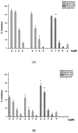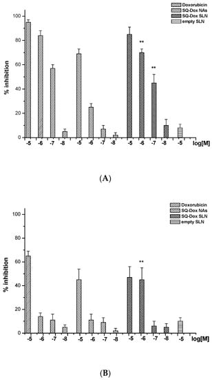 Inhibition of A2780 (A) and A2780 res (resistant) (B) cell proliferation following Dox, SQ-Dox NAs and SQ-Dox SLN1 treatment. Cells were treated with increasing concentrations (expressed as Dox equivalent) of compounds and empty SLNs for 72 h. Six replicates were used to determine each data point, and five different experiments were performed. One-way ANOVA and Dunnett’s test revealed statistically-significance differences (** p < 0.01) between the effects caused to A2780 res cells of the loaded SLNs vs. SQ-Dox treatments.