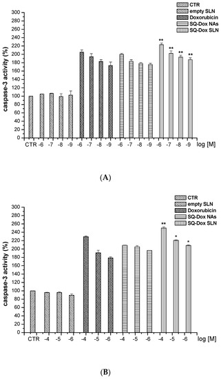 SQ-Dox and loaded SLNs significantly increased caspase-3 activity in the A2780 res cell line, compared to Dox-treated cells, at all the concentrations tested. However, the loaded SLN formulation exerted a higher efficacy, at a concentration of 10−5 M, than that exerted on SQ-Dox-treated cells at the same concentration (Panel B). Treatment with empty SLNs displayed the same effects as those observed in untreated cells.