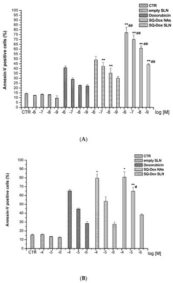 Levels of annexin-V-positive cells after Dox, SQ-Dox NAs, SQ-Dox SLN1 treatment. Annexin-V activity was evaluated in A2780 (A) and A2780 res (B) cell lines cultured for 72 h in either the presence or absence of Dox, SQ-Dox NAs, SQ-Dox SLN1 or empty SLNs. * p < 0.05 and ** p < 0.01, vs. Dox-treated cells at the same concentrations; # p < 0.05 and ## p < 0.01 vs. SQ-Dox-treated cells at the same concentrations, from three independent experiments.