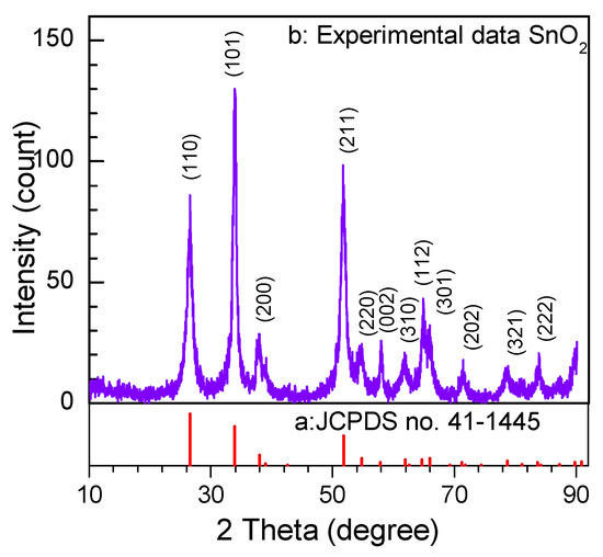 where k is the Scherer constant taking the value of 0.89, λ is the wavelength of the X-ray source taking the value of 1.5406 Å, β is the full width at half maximum (FWHM), and θ is the Bragg angle. According to Scherer’s equation, the mean particle size of the as-prepared products that correspond to the (101) plane diffraction peak is about 7.8 nm. The small size effect of the nanoparticles may lead to a large specific surface which is beneficial to the performance of the gas sensor. On the other hand, it is obvious from Figure 2 that the (101) peak is relatively stronger than (110), which demonstrates that the dominant expose surface is (101), but not (110). It is an important result that the exposed special high-energy surface of SnO2 will result in a good effect on the gas-sensing performance.