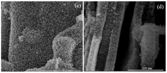 The FESEM images of the as-prepared products are shown in Figure 3. As shown in Figure 3a, the panoramic image reveals that the as-prepared nanosheets display a large and continuous area, and a smooth surface. From Figure 3b, it is clear that there is an abundance of protuberant pots on the surface of the nanosheets, which illustrates that the nanosheets are formed by a mass of small SnO2 nanoparticles. In order to further observe the microstructure of the nanosheets, FESEM was employed to acquire the higher magnification image, as shown in Figure 3c. It can be seen that the nanosheets are assembled by an abundance of uniformly-sized particles with diameters of 6–12 nm. A cross-edge section FESEM image of the nanosheets, as shown in Figure 3d, displays that SnO2 nanoparticles are densely distributed and tightly packed to form the layers of nanosheets. Moreover, it is obvious that the SnO2 nanosheet is tightly combined by 4–8 nanoparticle layers with an apparent interface in the center of the nanosheet, and the edge thickness of the nanosheet is about 58.3 nm. All of these observations are in good agreement with the XRD results. Due to the large and continuous area of nanosheets and the small size of nanoparticles, the as-prepared nanosheets might yield good gas-sensing properties.