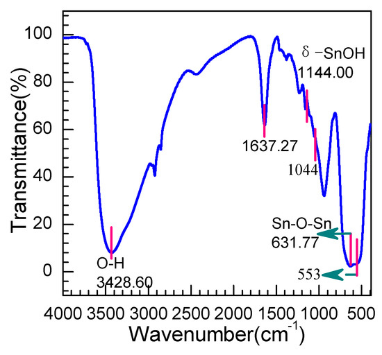 From the IR spectra shown in Figure 7, several absorption peaks are observed at wavelengths of 3428, 1637, 670, and 553 cm−1, respectively. The peaks around 3428.60 and 1637.27 cm−1 are ascribed to hydroxyl group stretching vibrations and bending mode vibrations associated with the absorption of a few molecules of water [33], which suggests a good adsorption capability of the as-prepared products. The bonds in the wavelength range from 1500 to 1060 cm−1 are ascribed to a bending mode of different types of trace hydroxyl hybrid produced of the as-prepared SnO2, such as the weak peak at 1144 cm−1 being due to the δ–(SnOH) stretching vibrations [34]. The key characteristic peaks at low wavenumbers, including 632 cm−1 and 553 cm−1, are assigned to the antisymmetric and symmetric Sn–O–Sn vibration [35], which is derived from the active IR modes Eu (TO) mode at 618 cm−1 and the A2u (TO) mode at 477 cm−1 [36]. The shift of peaks toward the higher wavenumber may be related to the small nanoparticle size and the morphology of the SnO2 nanosheets.