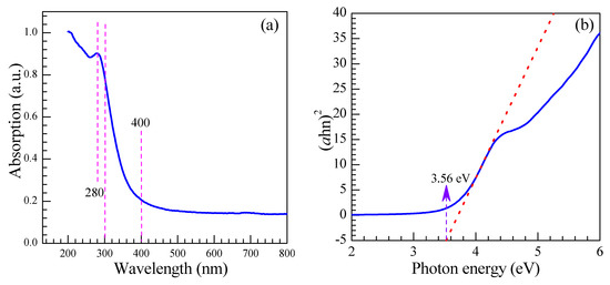 The UV-VIS spectrum of the as-prepared SnO2 nanosheets in the wavelength range of 200 to 800 nm is shown in Figure 8a. It indicates that a strong absorption has taken place in the ultraviolet region near the visible light. However, beyond that, a weak absorption peak around 275 nm can be seen in the spectrum, which is also observed by Luo et al. [37]. As displayed in Figure 8b, the optical band gap (Eg) of the as-prepared SnO2 nanosheets is calculated to be 3.56 eV via the equation: (αhv)2 = B(hv − Eg). It is found to be close to 3.6 eV, which is the theoretical value of the tetragonal rutile SnO2.