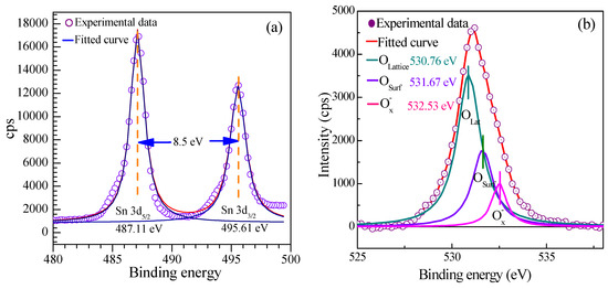 The XPS spectra were carried out to survey the chemical composition and the surface valence state of the as-prepared SnO2 nanosheets. The measured spectra was decomposed into Gaussian components with a Shirley background using XPSPEAK. Figure 9 shows the Sn 3d and O 1s spectra of SnO2 nanosheets, respectively. Figure 9a depicts the better symmetrical high-resolution XPS spectra of Sn 3d. The classical doublet 3d3/2–3d5/2 splitting peaks at 495.61 and 487.11 eV can be assigned to the lattice tin in SnO2. The 8.50 eV of the energy difference between Sn 3d5/2 and Sn 3d3/2 is in good agreement with the energy splitting reported for SnO2 [11]. The Sn 3d5/2 peak is closely consistent with the standard data of SnO2 (486.70 eV), indicating that Sn is present in a chemical state of +4. As shown in Figure 9b, the narrow scan XPS spectrum of the O 1s demonstrates the broad and asymmetric characteristics, suggesting various coordinations of oxygen in the nanosheets. The obtained O1s peak can be carefully convoluted into three symmetrical peaks located at 530.76 eV, 531.67 eV, and 532.53 eV, respectively, indicating the presence of three kinds of oxygen species in the nanosheets. The main peak centered at 530.23 eV is assigned to oxygen ions in the SnO2 crystal lattice (O lattice) under completely-oxidized stoichiometric conditions [38]. The peaks located at 531.67 eV can be ascribed to the defective oxygen caused by oxygen vacancy (VO), oxygen interstitial (Oi), and oxygen antisite (OSn) [39], suggesting a high hole concentration within oxygen-deficient region. Those holes can promote the absorption of oxygen from the atmosphere. The peak located at 532.53 eV stems from the absorbed Ox− species (O− or O2− ions), which indicates that rich oxygen species adsorbed on the surface of the SnO2 nanosheets. The adsorbed Ox− ions are reactable with the ethylene glycol gas molecules, which then enhance the holes concentration. Thus, the increase of adsorbed oxygen ions can promote the gas sensitivity of the SnO2 nanosheets.