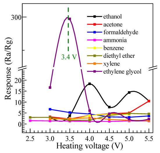 In order to investigate the influence of operating voltage and response to different gases, a series of tests were performed for various gases to the concentration of 300 ppm at an operating voltage ranging from 2.5 to 5.5 V, and the results are shown in Figure 11. It demonstrates a similar change trend of the response to all kinds of gases. With the increase of operating voltage, the response increases firstly, reaches its maximum at a suitable temperature, and then decreases rapidly. This phenomenon can be explained by the mechanism of oxygen adsorption and desorption on the surface of SnO2 [40]. As an n-type metal oxide semiconductor, SnO2 can adsorb oxygen from the air in the species of O2− and O− at different temperatures. Among of them, the O− can react violently with reducing volatile organic compound vapors, such as ethylene glycol, while the interaction of the O2− between the volatile organic compound vapors is slower, comparatively. Hence, the operating temperature has a significant influence on the response for volatile organic compound vapors. At a relatively low heating voltage (operating temperature), the sensor shows a lower response because the dominant process, in this case, is the superficial adsorption of O2−. With the increase of the operating voltage, the dominant process becomes the O− adsorption and the response increases, whereas, if the heating voltage increases continuously, the process turns into the adsorption of all oxygen ionic species and the response decreases [41]. From Figure 11, it can be found that the sensor made of SnO2 nanosheets exhibits an excellent response to ethylene glycol. The maximum of the gas sensitivity achieves 295 at the lower heating voltage 3.4 V. However, the maximum response to ethanol, acetone, formaldehyde, ammonia, benzene, diethyl ether, and xylene, at their respective optimum heating voltages, is much lower. It can be calculated that the response to ethylene glycol is 16, 28, 44, 199, 66, 62, and 110 times higher than that of those gases. Even for ethanol, the maximum response reaches 18 times higher at the optimum heating voltage of 4.0 V. Obviously, the gas sensor based on SnO2 nanosheets shows the high response, good selectivity, and lower optimum temperature for ethylene glycol. As a surface-controlled n-type semiconductor, the gas-sensing properties of SnO2 are dominantly controlled by surface adsorption, which made the surface energy and conductance change. In other words, the selectivity of the sensor is affected by several factors, such as LUMO (lowest unoccupied molecule orbit) energy of the gas molecule, activation energy of the reaction between gas molecules, and adsorbed oxygen and the amount of gas adsorption on the sensing material at different operating temperatures. For a different value of the LUMO energy for the tested gases, the energy needed for the gas-sensing reaction will be different. This indicates that the needed conditions of the reaction between the gas molecules and the adsorbed oxygen is not the same for different gases. Thus, the sensors can detect the different target gases at suitable operating temperatures. The SnO2 nanosheet material here shows a comparably lower response to ethanol, acetone, formaldehyde, ammonia, benzene, diethyl ether, and xylene, which means relatively good selectivity.