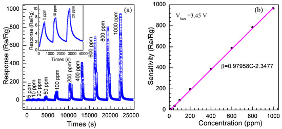 The correlation curve between concentration of the ethylene glycol and the response function of the SnO2 nanosheet sensor at the optimum heating voltage of 3.4 V is depicted in Figure 12b. It can be seen that the response of the sensors increased with the increase of gas concentration. The responses of the nanosheets sensor reaches 38.1, 92.9, 175.5, 298.7, 682.5, 785.4, and 936.7 at 50, 100, 200, 400, 600, 800, and 1000 ppm, respectively. A linear dependence of the sensitivity on the ethylene glycol concentration is observed from 5 to 1000 ppm, suggesting that our sensor material will be able to measure a wide concentration range in practical application. It can be considered that the linear dependence of the response on concentration may be associated with the effect of the small size. The straight line of the response to the concentration of ethylene glycol is the calibration curve and the experimental data are fitted as: