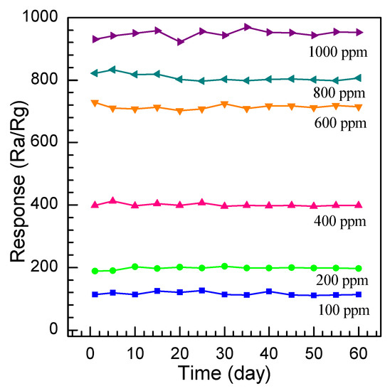Finally, the long-term stability of the nanosheet gas sensors is inspected. The gas response evolution of the SnO2 nanosheet sensors was measured by repeating the measurement a number of times at concentrations of 100, 200, 400, 600, 800, and 1000 ppm at the optimum operation voltage of 3.4 V for 60 days. Figure 14 demonstrates the response changes are measured on the 5th, 10th, 15th, 20th, 25th, 30th, 35th, 40th, 45th, 50th, 55th, and 60th day after the first measurement. It can be calculated that the slight vibration of the 60-days-later response is ±8.3%, ±5.8%, ±6.5%, ±10.2%, ±9.4%, and 11.2% for 100, 200, 400, 600, 800, and 1000 ppm ethylene glycol gas, respectively, which illustrates a good stability and reliability of the SnO2 nanosheet sensor for practical application.