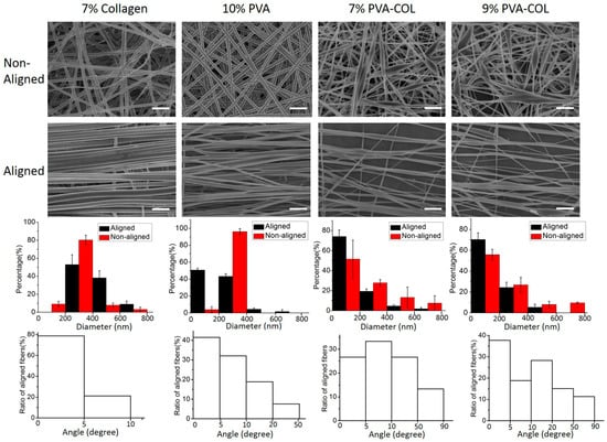 The designed parallel double thin plates collectors with an independent fiber removal device were used to obtain aligned fibers, which has been described in detail by our previously published paper [25]. The SEM images of the 7% collagen (aligned and random), 10% PVA (aligned and random), 7% PVA-COL (aligned and random) and 9% PVA-COL (aligned and random), the diameter range histogram of the above aligned and random fibers, and the alignment degree histogram of the above aligned fibers which were shown as the average value calculated from six samples, are shown in Figure 1, and their average diameter is shown in Table 1. From the SEM images and the histogram of the diameter range, we found that the fibers of pure collagen and pure PVA were more uniform than the PVA-COL composite nanofibers, and this may because the hybrid of collagen and PVA makes the mixture not as homogeneous as the pure one. The average fiber diameter of the random 7% PVA-COL nanofibers was 211.6 ± 142.5 nm, the diameters of 51.6 ± 18.8% of the random nanofibers were between 0 and 200 nm, 27.8 ± 3.2% between 200 and 400 nm, 13.3 ± 10.3% between 400 and 600 nm, and 7.5 ± 7.3% between 600 and 800 nm. The diameter of the aligned 7% PVA-COL was a little smaller than that of the random ones (183.3 ± 96.7 nm) and the diameter distribution of the aligned nanofibers was also narrower than that of the random ones: 74 ± 6.5% were between 0 and 200 nm and the rest were between 200 and 800 nm. The average fiber diameter of the random 9% PVA-COL nanofibers was 262.9 ± 199.3 nm, and the diameters of 55.7 ± 5.1% of the random nanofibers were between 0 and 200 nm, 26.8 ± 7.1% between 200 and 400 nm, 7.9 ± 3.2% between 400 and 600 nm and 9.5 ± 0.8% between 600 and 800 nm. The diameter of the aligned 9% PVA-COL was smaller than that of the random ones (163.1 ± 103.2 nm) and the diameter distribution of the aligned nanofibers was also narrower than that of the random ones: 70.2 ± 6.4% were between 0 and 200 nm and the rest were between 200 and 600 nm. Thus, the aligned PVA-COL nanofibers were smaller and more homogeneous than the random ones, which was in accordance with previous research results [34,35]. From the SEM images and the alignment degree histogram, we found that the alignment degrees of pure collagen and PVA nanofibers was higher than that of the composite nanofibers, and this may result from the increased charge improving the instability of whipping, resulting in the non-uniform splitting of the jet [36].