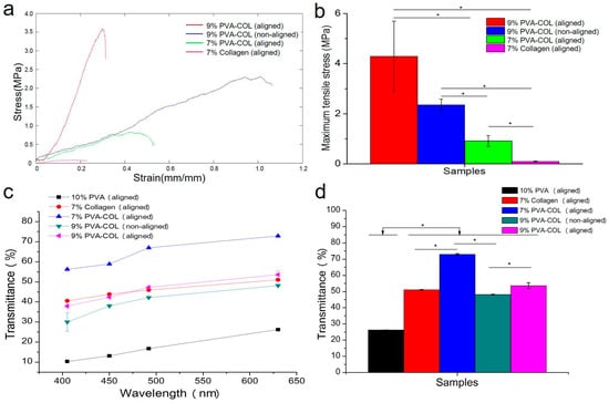Mechanical properties and transparency test results: (a) average strain–stress curves of the 9% PVA-COL (aligned and non-aligned), 7% aligned PVA-COL and collagen electrospun scaffolds; (b) maximum tensile stress histogram of the samples; (c) the average transmittance of the 10% aligned PVA, 7% aligned collagen, 7% aligned PVA-COL and 9% PVA-COL (aligned and non-aligned) electrospun scaffolds under the wavelengths of 405, 450, 492 and 630 nm; and (d) transmittance histogram of the samples under the wavelength of 630 nm. The data represent the means ± SD (* p < 0.05).