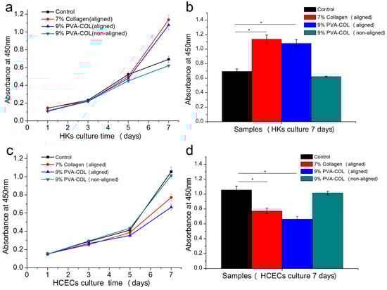 The proliferation results of the HKs and HCECs: (a) proliferation of HKs on the 7% aligned collagen and the 9% PVA-COL (aligned and non-aligned) electrospun scaffolds within seven days; (b) proliferation histogram of the HKs in the different electrospun scaffolds cultured for seven days; (c) proliferation of HCECs on the 7% aligned collagen and the 9% PVA-COL (aligned and non-aligned) electrospun scaffolds within seven days; and (d) proliferation histogram of the HCECs in the different electrospun scaffolds cultured for seven days. The control group was the cells that were seeded on the culture plate, the data represent the means ± SD (* p < 0.05).