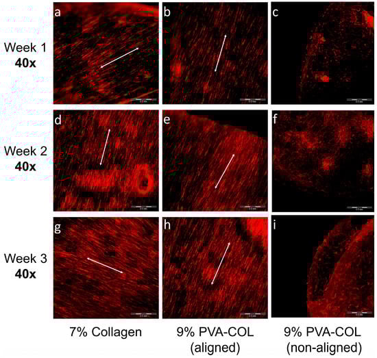 RFP labeled HKs: on the 7% aligned collagen (a,d,g); and the 9% PVA-COL aligned (b,e,h); and non-aligned (c,f,i) scaffolds that were cultured for: one week (a–c); two weeks (d–f); and three weeks (g–i). The scale bar is 500 μm.
