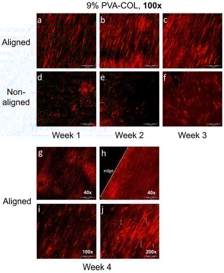 The HKs growth on the 9% PVA-COL scaffolds: (a–c) on the aligned scaffolds that were cultured for one, two and three weeks; and (d–f) on the random scaffolds that were cultured for one, two and three weeks. The scale bar is 200 μm. (g–j) The aligned 9% PVA-COL scaffolds after culturing for four weeks. Scale bar: (g,h) 500 μm; (i) 200 μm; and (j) 100 μm.