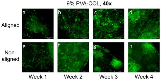 It is common knowledge that cells react differently to micro-topography and nano-topography, and can be guided by using physical cues to mimic natural tissues [43,44]. It is suggested that some cells distribute randomly within a non-woven scaffold and grow orderly on an aligned scaffold. The fluorescently labeled HKs and HCECs were inoculated on the aligned and non-aligned collagen and the PVA-COL electrospun scaffolds to determine the biocompatibility of the composite materials and the effect of the fiber alignment degree on the behavior of the HKs and HCECs.