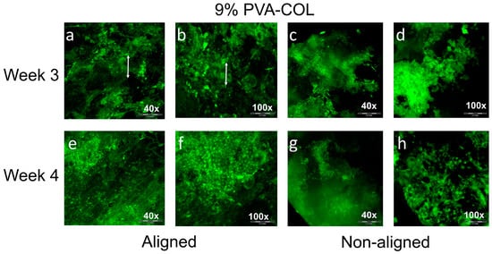 Finally, we tracked the HK growth on the 9% aligned PVA-COL scaffold after culturing for four weeks and observed the cell morphology and growth pattern under magnifications of 40×, 100× and 200×, as shown in Figure 5g–j. Under the 40× magnification shown in Figure 5g,h, most cells adhered and proliferated on the scaffold, completely merging and arranging orderly along one orientation. Figure 5h also shows the edge of the scaffold and petri dish, indicating that the cells only adhered and proliferated in the scaffold. In the higher magnification images shown in Figure 5i,j (100× and 200×, respectively), it was clearly observed that the cells were joined with periphery cells, merging into entire multi-cell sheets, and the cells between the different layers also had junctions.