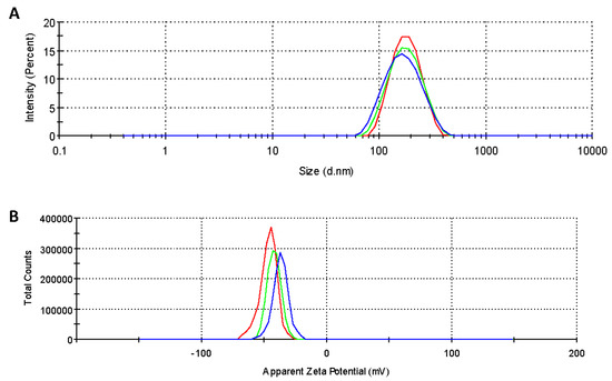 Characterization of silk fibroin nanoparticles (blue), curcumin-loaded silk fibroin nanoparticles synthesized by physical adsorption (green) and curcumin-loaded silk fibroin nanoparticles synthesized by coprecipitation (red): (A) size distribution; and (B) Zeta Potential measured at 25 °C in purified water.