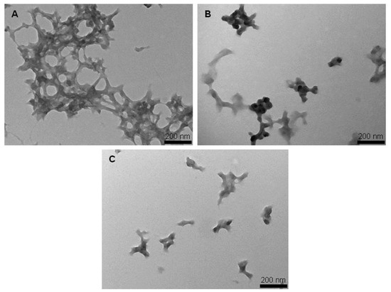 Transmission Electron Microscopy images of: (A) silk fibroin nanoparticles; (B) curcumin-loaded silk fibroin nanoparticles synthesized by physical adsorption; and (C) curcumin-loaded silk fibroin nanoparticles synthesized by coprecipitation (59,000×).