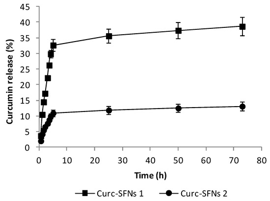 The release behavior of the two types of Curc-SFNs (Curc-SFNs 1 and Curc-SFNs 2) was evaluated. The studies were carried out at 37 °C in PBS 1× (with 0.5% Tween 80 due to the poor solubility of curcumin in PBS). A notable difference in the release rate was seen between the two Curc-SFNs. For both types of nanoparticles (Figure 4), burst release was observed in the first 5 h, becoming plateau after 24 h. Curcumin release was higher for the Curc-SFNs 1, reaching a maximum value of approximately 35% of the loaded drug, while in the case of the Curc-SFNs 2, the maximum value was around 10% (Figure 4). This difference in the release of the two Curc-SFNs was probably due to the lower drug loading of the Curc-SFNs 2. In addition, in the authors’ opinion, it might also be because Curc-SFNs 2, which are synthesized by coprecipitation, probably have the drug encapsulated inside the nanoparticle, making more difficult its release. On the contrary, in the case of Curc-SFNs 1, the drug is mainly adsorbed onto the surface so the release could be easier.