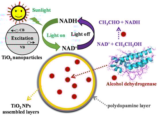 Schematic illustration of the cycling of nicotinamide coenzymes NAD+/NADH catalyzed by the bioinspired ADH@TiO2 NP microreactors. The polydopamine layer was formed by means of in situ polymerization of dopamine and used as a photosensitizer for the activation of the TiO2 NP membrane under visible light. During cycling of NAD+/NADH, enzymatic regeneration of NADH from NAD+ reduction is catalyzed by alcohol dehydrogenase and subsequent photocatalytic oxidation to NAD+ takes place by the PDA-modified TiO2 NP membrane under visible light irradiation.