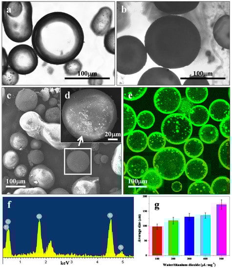 Microscopic images of the ADH@TiO2 NP microreactors. (a,b) Optical images; (c,d) SEM images; and (e) CLSM image. (a) Water-in-oil Pickering emulsions before being cross-linked by TEOS; (b) Water-in-water microcapsules after being cross-linked by TEOS; (c,d) SEM images of the dried ADH@TiO2 NP microreactors; (e) CLSM image of the FITC labeled ADH@TiO2 NP microreactors; (f) EDS analysis of the ADH@TiO2 NP microreactors; (g) Average size distributions, median values, and standard deviations were calculated by fitting Gaussian functions to the histograms.