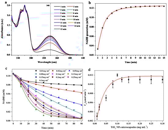 UV-Vis spectra showing that the increase in absorption intensity at 340 nm is consistent with the reduction of NAD+ to NADH in a reaction mixture containing NAD+ (1 mM, 300 µL), ethanol (50%, 100 µL), and ADH (10 µg·mL−1, 100 µL) at 37 °C and pH 7.5. (a) Corresponding plots of intensity at 340 nm vs. time; (b) Plots of NADH concentration vs. time. UV-Vis absorption intensity at 340 nm was consistent with the oxidation of NADH to NAD+ under visible light irradiation in a reaction mixture containing NADH (1 mM, 200 µL), TiO2 NP microcapsules without ADH and with varying TiO2 NP microcapsules concentrations from 0.01 to 0.3 mg·mL−1 at 37 °C and pH 7.5; (c) Corresponding plots of NADH concentration decreasing vs. time; (d) Initial velocity (V0) vs. concentration of the microcapsules.