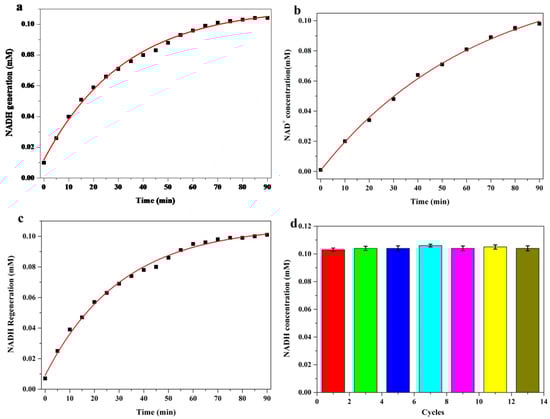 NAD+/NADH cycling performance catalyzed by ADH@TiO2 NP microreactors. (a) Reduction of NAD+ to NADH; (b) Oxidation of NADH to NAD+ under visible light irradiation; (c) Regeneration of NADH from oxidized NAD+; (d) Cycling performance in 13 cycles. A reduction reaction mixture containing ADH@TiO2 NP microreactors (0.1 mg·mL−1), NAD+ (1 mM, 300 µL), and ethanol (50%, 100 µL) at 37 °C and pH 7.5.