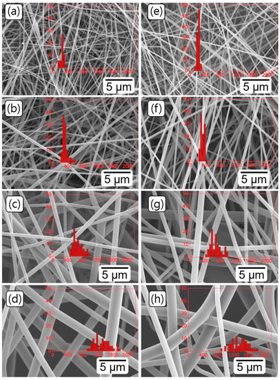 SEM images of the electrsopun nanofibers of PEICT and PICT with different concentrations. The left column shows the morphology of PEICT nanofibers at: (a) 6; (b) 10; (c) 12 and (d) 18 wt %. The right column shows PICT nanofibers at: (e) 6; (f) 10; (g) 12 and (h) 18 wt %. Insert images present size distribution of nanofibers.