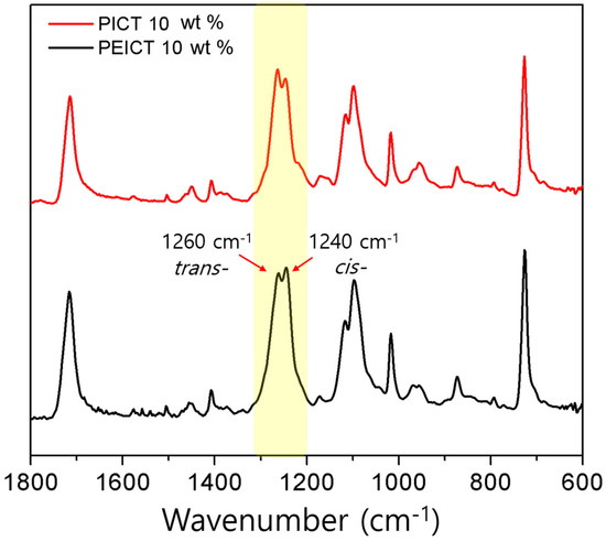 One of the most widely utilized polymers is poly (1,4-cyclohexanedimethylene terephthalate) (PCT), an aromatic semicrystalline polyester [15]. The cyclohexylene ring of CHDM flips from e,e-trans structure to a,a-trans at room temperature via twisted-boat conformation, enhancing chain mobility [16]. This allows for relaxation from its conformational transition, resulting in ductility along with other outstanding properties. Since our two polymers, PEICT and PICT, are based on the PCT structure, they also have the ability to ring flip from the trans structure. However, in the case of PEICT, incorporating ISB and EG makes a complex polymer that hinders the formation of the trans structure. In addition, the unique V-shape structure of ISB makes for an unfavorable crystallization and ring flip structure. The trans structure of PEICT and PICT nanofibers (10 wt %) was confirmed by FT-IR spectroscopy. The spectra did not show any distinguishing differences, except for peaks at 1240 and 1260 cm−1, which are assigned to C–O stretching in the cis and trans structures of CHDM-COO-terephthalate (TER), respectively [3]. As presented in Figure 3, the trans peak (1240 cm−1) of CHDM-COO-TER showed stronger intensity than that of the cis conformation peak in PICT nanofiber spectra. On the other hand, in PEICT nanofiber spectra, the peak at 1260 cm−1 was reduced to less than that of PICT, indicating deformation of the trans configuration of CHDM due to the complex structure of PEICT. Therefore, the cis configuration of CHDM is more prevalent than trans in PEICT nanofiber.