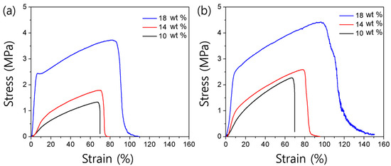 Stress-strain curves measured for: (a) PEICT and (b) PICT electrospun mats made with polymer concentrations ranging from 10 to 18 wt %.