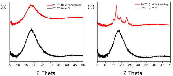 We also conducted X-ray diffraction studies to compare the crystallization behaviors of each nanofiber. Figure 5 shows the wide-angle X-ray diffraction spectra of PEICT and PICT nanofibers. Both have relatively low crystallinity due to the rapid fabrication process and complicated chemical structures of the polymers. In particular, ISB is unfavorable for crystallization due to its unique V-shape structure [3]. For both PEICT and PICT nanofibers, only a broad peak was observed at 2θ = 18°, typically indicating semi-crystalline regions attributable to the ordering of the polymer chains. It is worth mentioning that noticeable peaks appear for PICT nanofiber after annealing at 180 °C for 3 h, while there is no transition to crystalline in PEICT nanofiber due to its complex polymer structure [7].