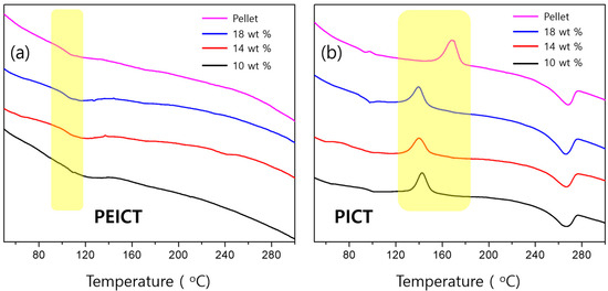 DSC curves of: (a) PEICT and (b) PICT nanofibers with different polymer concentrations.