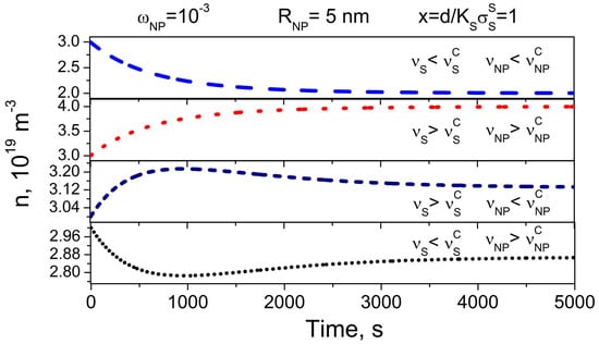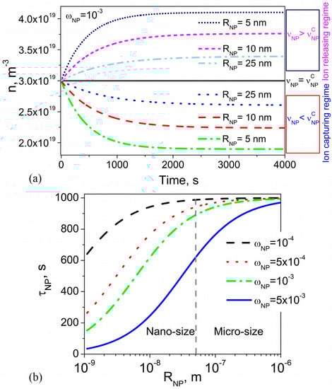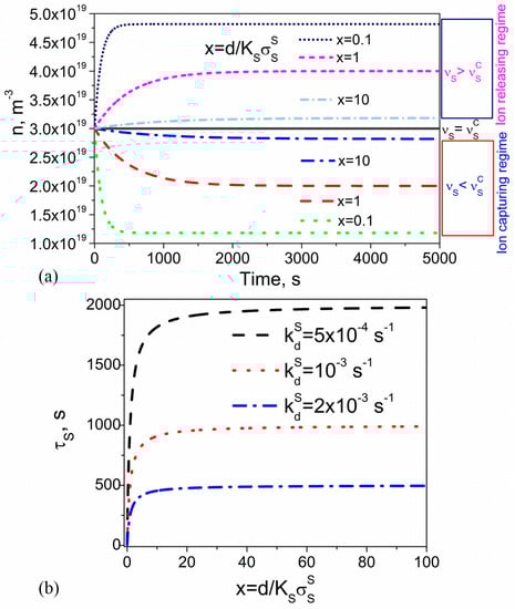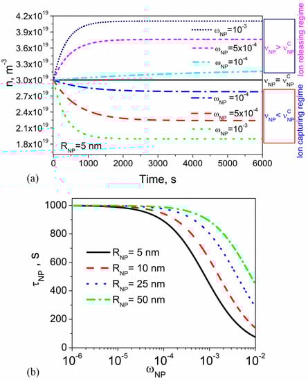 The time dependence of the ion-capturing regime is represented by dashed and short-dotted curves in Figure 4. Dotted and short-dashed curves show the kinetics of the ion-releasing regime (Figure 4). The kinetics of ion-capturing/ion-releasing processes is characterized by two time constants, and , originated from the presence of nanoparticles and substrates, respectively. An interesting feature is the possibility of both monotonous (Figure 4, dashed and dotted curves) and non-monotonous (Figure 4, short-dotted and short-dashed curves) time dependence .
