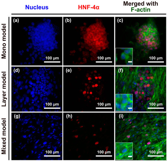(a–i) Structural morphology of cancer cells and fibroblasts or cancer cells alone on the nanofibrous membrane after seven days of culture. Immunofluorescence of DAPI-stained nuclei (blue), hepatocyte nuclear factor 4 alpha (HNF4α, red), and the cytoskeleton protein F-actin (green). Merged images of the experimentally designed mono model (c); layer model (f); and mixed model (i). Unmarked scale bars, 10 μm.